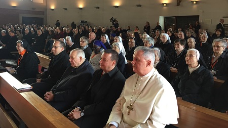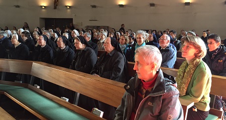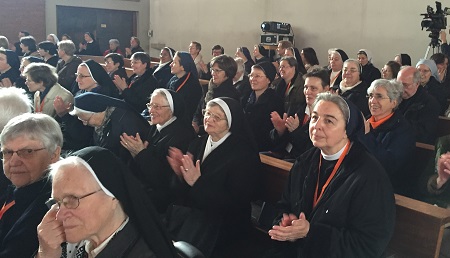 „Ordensleben wird in Europa zur Randerscheinung, wir werden zur Fussnote werden. Es scheint, als hätten wir Ordensleute unsere Mystik verloren. Zurück zu den Gründern reicht heute nicht aus. Die Krise ist dauerhafter.“ So schildert die aus Österreich stammende Ordensfrau die Situation vor mehr als 300 Ordensfrauen und Gästen beim Festakt in der Pfarrkirche Saggen. Unter den Gästen Diözesanadministrator Jakob Bürgler, Bischof em. Maximilian Aichern, der Wiltener Abt Raimund Schreier, der Generalsekretär der Bischofskonferenz Peter Schipka, die Österreichvorsitzende der Katholischen Frauenbewegung Veronika Pernsteiner und die Direktorin der Katholischen Sozialakademie Magdalena Holztrattner.