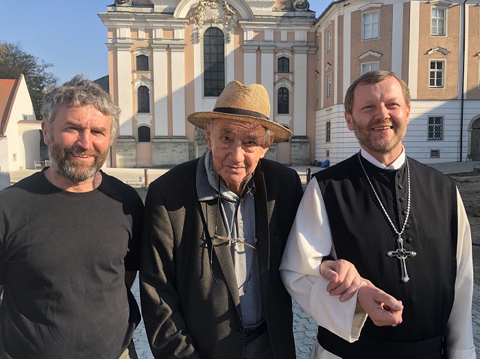 Wilhelm Scherübl (li), Daniel Spoerri und Abt Reinhold Dessl im Stiftshof