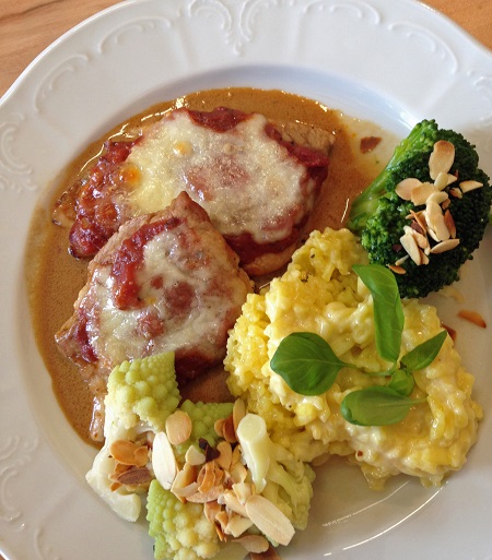 Schnitzel mit Salz und Pfeffer leicht würzen, in Öl scharf anbraten, auskühlen lassen. Im Bratenrückstand Zwiebeln anrösten, mit Mehl stauben und mitrösten, mit Weißwein und Suppensud aufgießen, Sauce auf kleiner Flamme reduzieren lassen, pürieren und abschmecken. Mozzarella in Scheiben schneiden, Pellati mit Kräutern, Salz, Pfeffer würzen, auf die ausgekühlten Schnitzel verteilen; mit den Mozzarellascheiben belegen. Bei 160° ca. 15 Minuten im Rohr überbacken.