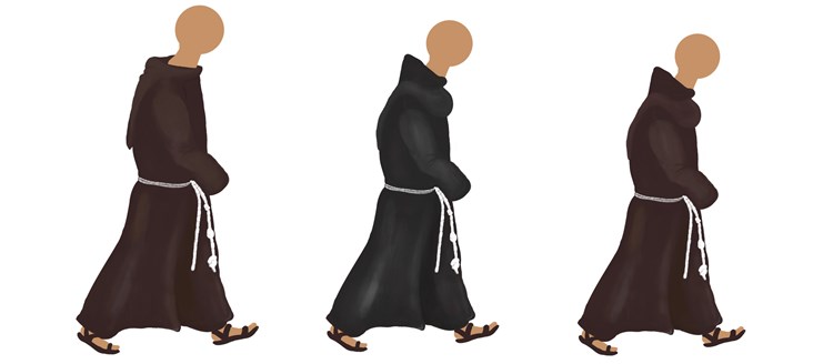 Illustration der Habite von Kapuzinern (links, mit langer Kapuze direkt am Habit), Minoriten (mitte, schwarz) und Franziskanern (rechts), der drei Zweige des Franziskanerordens. Braun war im Mittelalter die Farbe der Armen. (c) katholisch.de/Caroline Wegener/@CarOLONIAcrossMedia