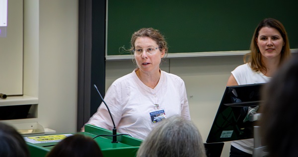 Abb. 2: Mag. Sonja Führer und Mag. Irene Kubiska-Scharl bei der Präsentation von KOBi - Katalog der Ordensbibliotheken. (c) Diözese Linz