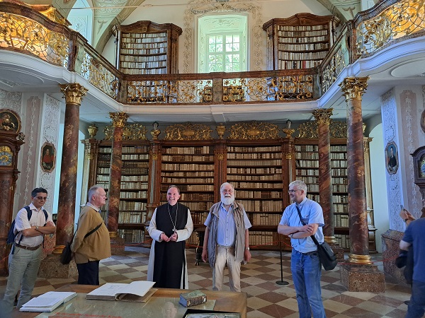 Am Nachmittag führte eine Exkursion die Teilnehmenden ins Zisterzienserstift Schlierbach. Abt Nikolaus Thiel und P. Friedrich Höller, Bibliothekar des Stifts, begrüßten die Teilnehmer:innen und führten im Anschluss an eine Käseverkostung durch die Bibliothek und das Stift.