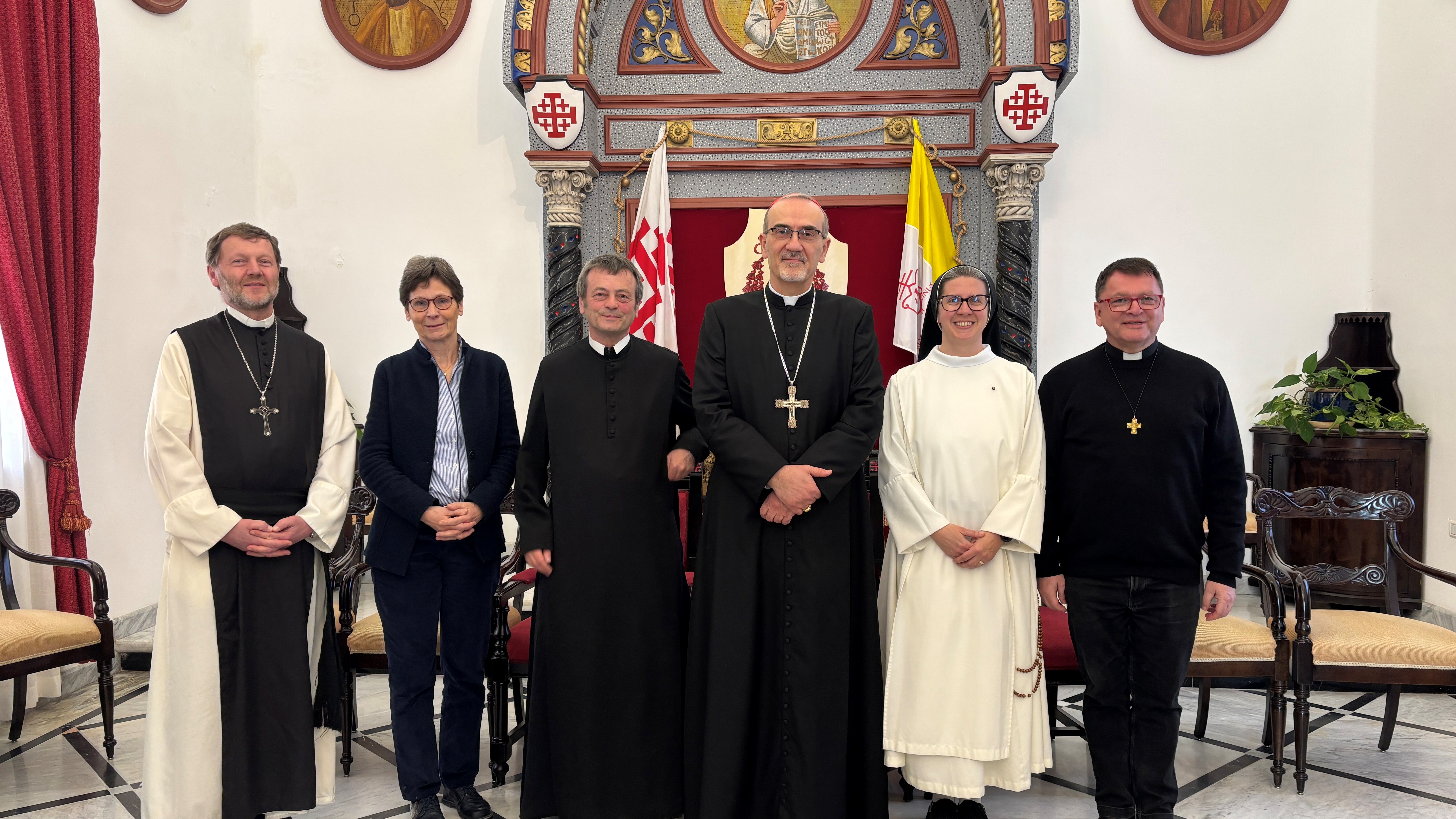 Vertreter:innen der Ordenskonferenz und der Initiative Christlicher Orient zu Besuch beim Lateinischen Patriarchen von Jerusalem (v.l.): Abt Reinhold Dessl (Stift Wilhering), ÖOK-Generalsekretärin Sr. Christine Rod, P. Laurentius Resch (ICO und Stift Seitenstetten), Kardinal Pierbattist Pizzaballa, ÖOK-Vorsitzende Sr. Franziska Madl und Salesianer-Provinzial P. Siegfried Kettner. © ÖOK/rm Fotodownload