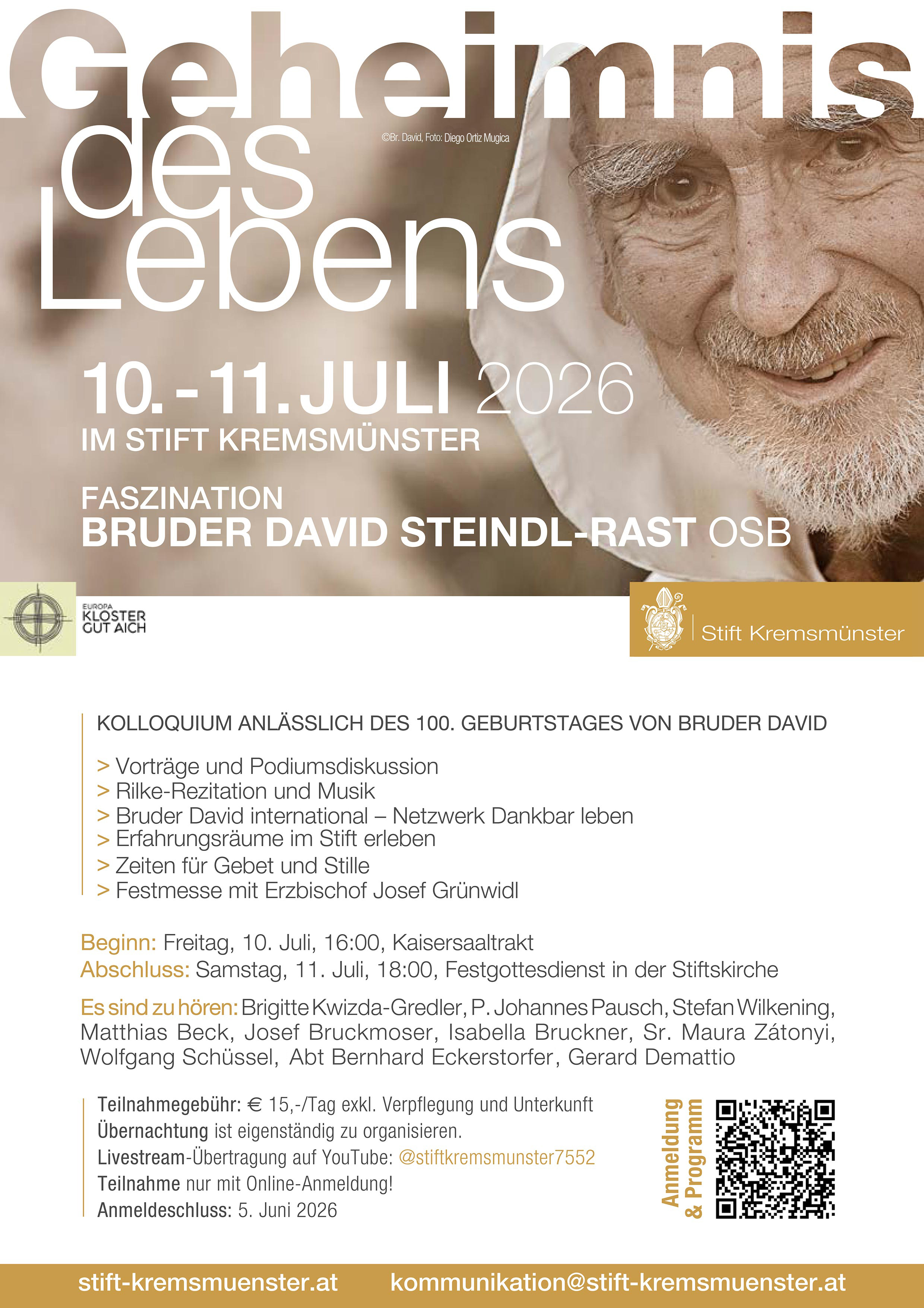 Mit einem zweitägigen Kolloquium im Stift Kremsmünster wird Br. David Steindl-Rast im Juli 2026 anlässlich seines 100. Geburtstags gewürdigt. Die Veranstaltung unter dem Titel „Geheimnis des Lebens“ findet am 10. und 11. Juli statt, kurz vor seinem runden Geburtstag. Neben Vorträgen umfasst das Programm spirituelle und kulturelle Elemente, u. a. eine Festmesse mit dem Wiener Erzbischof Josef Grünwidl sowie ein Live-Gesprächsformat mit Bruder David selbst. Die Veranstaltung findet in Kooperation mit dem Europakloster Gut Aich statt, in dem Br. David Steindl-Rast heute lebt.