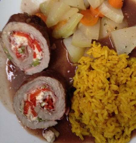 Schnitzel klopfen, leicht würzen; Frühlingszwiebeln und Paprika schneiden, Schafskäse schneiden, Zwiebeln hacken. Schnitzel mit Schinken, Frühlingszwiebeln, Paprika und Schafskäse belegen; einrollen. Auf allen Seiten scharf anbraten. In den Bratenrückständen Zwiebeln anrösten, mit Mehl stauben, kurz durchrösten. Mit Wein und Suppe aufgießen; Sauce reduzieren lassen, pürieren. Rouladen einlegen und garziehen lassen (je nach Fleischart 15–30 min).