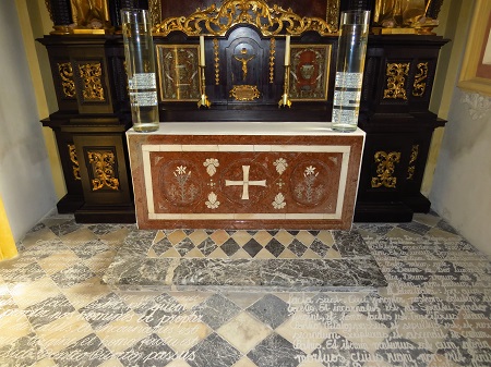 Zwei mit Wasser gefüllte Glaszylinder stehen auf dem Antoniusaltar. Das Wasser löscht nicht aus, sondern vergrößert die Namen derjenigen, die im Einsatz ihr Leben verloren haben. Ein rotes Licht hinter einem der Glaszylinder brennt Tag und Nacht als Toten-Gedächtnis.