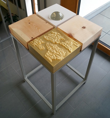 Das Objekt „HINGABE“, ein Tisch mit schachtelartiger Platte, der vier Elemente vereint und symbolisch das Kreuz der Kreuzschwestern bildet, ist eigens für die Ausstellung und den Kontext des Hauses entstanden. Ein Quader eröffnet die Assoziation mit einem Auge, in zwei weiteren Quadern schafft Zirbenholz eine Verbindung zur Natur und spricht als wohlriechender Werkstoff den Geruchssinn an. Dieser Naturbezug wird im vergoldeten vierten Teil des Objektes mit Rindensegmenten aufgenommen. Vielzählige Oberflächen, Materialien und Formen gibt es für interessierte Besucher also nicht nur zu bestaunen, sondern ausdrücklich auch mit den Händen zu erfahren, fühlen und begreifen.