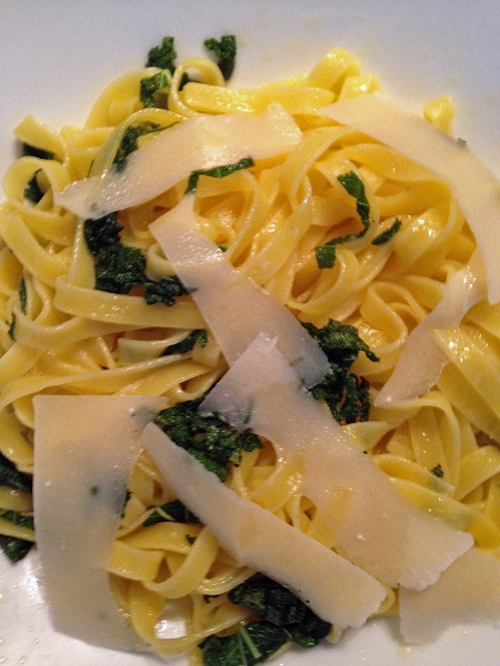 Nudeln al dente kochen, Salbeiblätter nudelig schneiden, Butter und Öl erhitzen. Salbei darin schwenken, salzen. Nudeln direkt aus dem Kochwasser (etwas Wasser an den Nudeln lassen) zugeben, vermischen. Käse mit Kartoffelschäler oder Hobel blättrig schneiden, auf vorgewärmten Tellern anrichten.