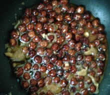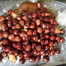 Grillage: Butter schmelzen, Zucker zugeben und bräunen (karamelisieren); Haselnüsse darin wenden. Masse auf befettetes Backpapier geben, erkalten lassen, im Mörser stoßen oder mittelfein mahlen.