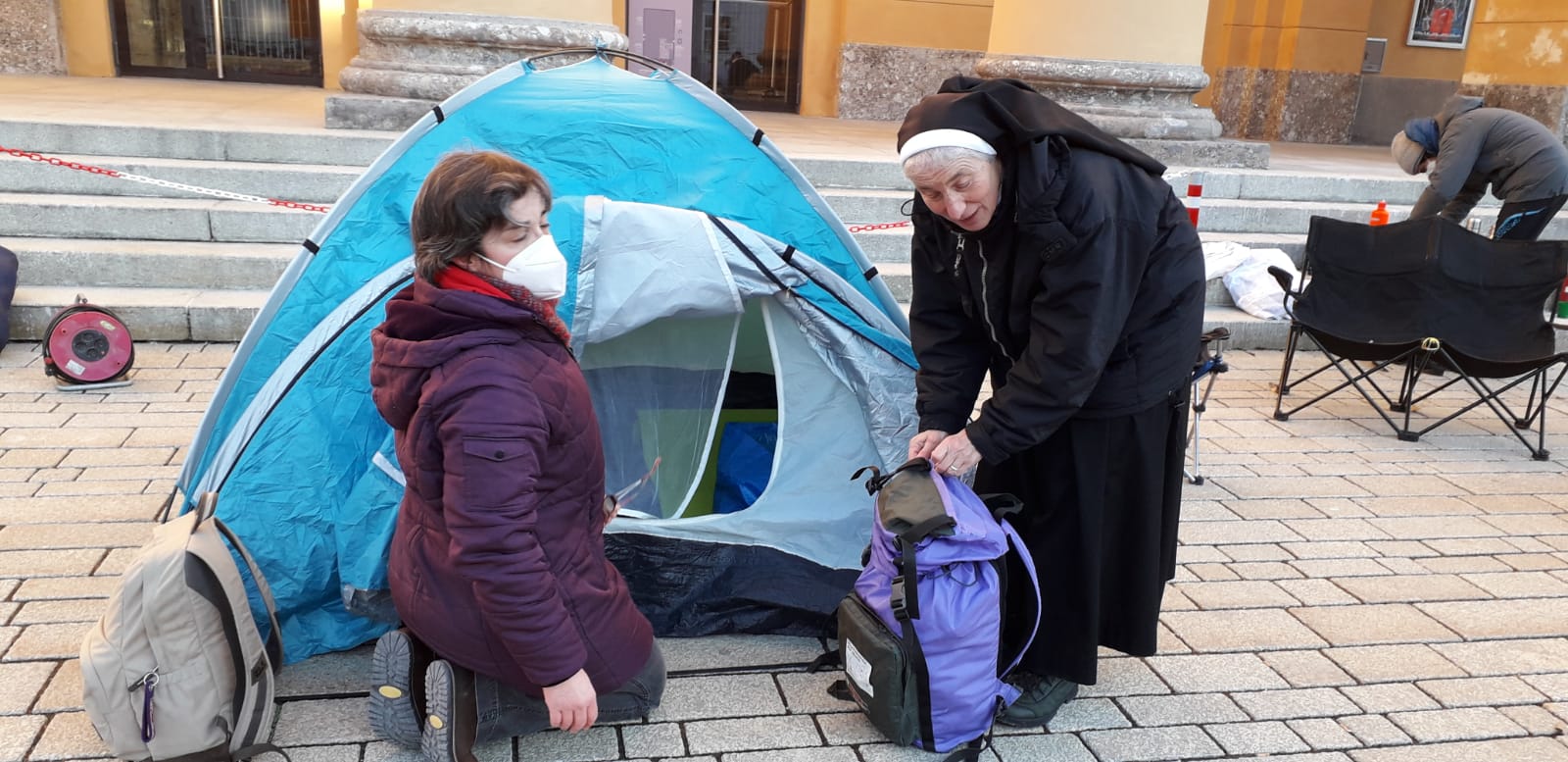 Die beiden Ordensfrauen Sr. Christina Blätterbinder (li.) und Sr. Notburga Maringele (re.) beim Camp für Moria vor dem Tiroler Landestheater. (c) Tertiarschwestern Hall/Tirol Download