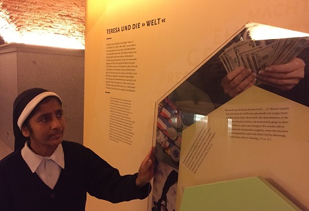 "Eine Heilige für die Moderne" lautet der Titel der Ausstellung. Sieben Stationen vermitteln Teresas Leben und Werk (1515-1582). Eine graphisch ausgefeilte Zeitleiste beschreibt zunächst die wichtigsten Lebensstationen Teresas und eröffnet den Blick auf ihre Epoche vor etwa 500 Jahren. Zeitgenossen wie Martin Luther oder Karl V. und Zeitereignisse wie die katholische Reform oder der Höhepunkt der Spanischen Weltmacht werden dabei thematisiert. Die zweite Station geht auf die heilige Teresa in der Kunst ein. Geläufig sind Darstellungen der Heiligen als Schriftstellerin und im Moment der „Herzverwundung“. Beispielhaft für diese Darstellungsformen sind Reproduktionen des authentischen Teresa-Portraits von Juan de la Miseria und Marmorplastik von Lorenzo Bernini in der Karmelitenkriche Santa Maria della Vittoria in Rom. Den Ausstellungstitel „Eine Heilige für die Moderne“ untermauert die dritte Abteilung der Ausstellung. Hier äußern sich so unterschiedliche Persönlichkeiten des 20. Jahrhunderts wie Simone de Beuavoir, Edith Stein, der österreichische Psychiater Josef Breuer, Roger Garaudy, Julia Kristeva, Vita Sackville-West oder Jacques Lacan zu Teresa. In einer offenen Bibliothek sind die deutsche Werkausgabe ihrer Schriften und weitere Teresa-Literatur frei zugänglich.