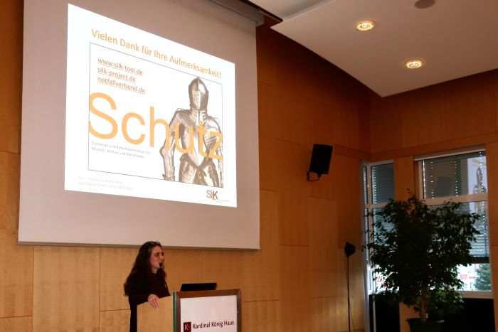 Die deutsche Denkmalschutz-Expertin Almut Siegel ermutigte die Teilnehmenden des Kulturtags zur Nutzung des Online-Tools "SiLK" (für Sicherheitsleitfaden Kulturgut). Das Angebot soll Sammlungen vor Schäden durch alle erdenklichen Notfälle schützen. "Beispiele für die Notwendigkeit gibt es auch aus den jüngsten Jahren viele", verwies die Referentin auf den Brand im brasilianischen Nationalmuseum in Rio de Janeiro 2018, jenen der Pariser Kathedrale Notre-Dame 2019 sowie zuvor den Wasserschaden im Schloss Ehrenstein bei Gotha 2013 oder den Brand in der Berliner Philharmonie 2008. SiLK war einst selbst als Reaktion auf den Einsturz des Stadtarchivs Köln 2009 gestartet worden.
