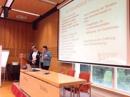 Sr. Anna Mayrhofer, Franziskanerin Missionarin Mariens sowie Leiterin einer Schutzwohnung, und Sr. Susanne Krendelsberger, Generalleiterin der Caritas Socialis, stellen gemeinsam das Engagement des Vereins SOLWODI vor.