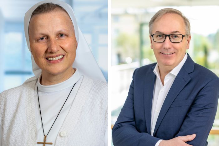 Sr. Romana Reznicek, Konventoberin der Kreuzschwestern, und Geschäftsführer Dietbert Timmerer sind auch in der heutigen Zeit die Werte des Ordensklinikums ein großes Anliegen. (c) Klinikum Wels‐Grieskirchen/Nik Fleischmann