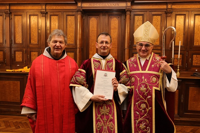 P. Moritz Windegger (Mitte) wurde von Bischof Wilhelm Kautwaschl (rechts) zum Diakon geweiht. (c) Sonntagsblatt/Gerd Neuhold