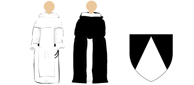 Wie die Franziskaner sind auch die Dominikaner ein Bettelorden. Das Ordensgewand der Dominikaner ist weiß. Wie bei den Benediktinern gibt es über dem Untergewand das Skapulier und eine Kapuze – nur eben in Weiß. Warum wurden die Dominikaner aber in England "Black Friars" genannt, also schwarze Brüder? Ganz einfach: Sie tragen beide Farben. Der Habit ist weiß, aber schwarz sind der Ledergürtel und der große Rosenkranz, der am Gürtel hängt, und vor allem der Mantel, den die Dominikaner tragen. Zu verschiedenen Anlässen ziehen sie den langen schwarzen Chormantel an, der eine Kapuze hat und nur vorne offen ist. Auch auf dem schwarz-weißen Wappen des Ordens ist das Gewand abgebildet; es bedeutet, dass man über dem weißen Habit der Freude und der Reinheit den schwarzen Mantel als ein Zeichen der Demut und der Bereitschaft zur Umkehr trägt.