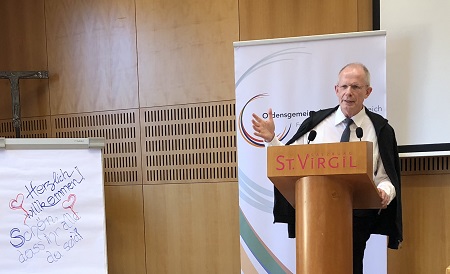 Der Theologe und Therapeut Georg Beirer aus Bamberg spricht zu den fast 90 SchulerhalterInnen und DirektorInnen katholischer Privatschulen und Ordensschulen über die „prophetischen Herausforderungen“ und der „Dynamik einer sich erneuernden Identität“. „Propheten schauen ungeschönt die Wirklichkeit an, weil sie die Wirklichkeit mit den Augen Gottes sehen können.“ Prophetisch wird man, wenn man zweckfrei an den Menschen erinnert. Zu oft ist heute vom „Faktor Mensch“ die Rede. „Wer die Wirklichkeit wirklich sieht, wird eine Leidenskompetenz aufbauen. Er oder sie sieht, was wirklich los ist.“ So wird immer wieder Not angesprochen, angeklagt und dagegen etwas getan werden. „Ordensschulen und katholische Schulen in anderer Trägerschaft sollten kritisches Denken hervorbringen. Alles Tun soll getragen sein von der Liebe zum Menschen, gerade zum leidenden und geschundenen.“ Auch Gott geht es immer um den Menschen: „Propheten erinnern ganz gefährlich an den Menschen. Sie sind Liebhaber der Menschen, haben Visionen und Lust auf neue Wege.“ Die Kompetenz gewinnen die Propheten in ihrer Offenheit auf Gott und die Menschen hin. Sie haben Geduld in ihrer Mühe und ebenso in der Ablehnung. „Selbstbewusst und aufrecht die Wirklichkeit bewältigen. Gerade auch als Fragment, das auf das Ganze hinweist.“ Beirer ermutigt die Schulverantwortlichen, „auch kreativen Widerstand zu leisten, wo der Mensch nicht in seinem tiefen Wert gesehen und behandelt wird“.