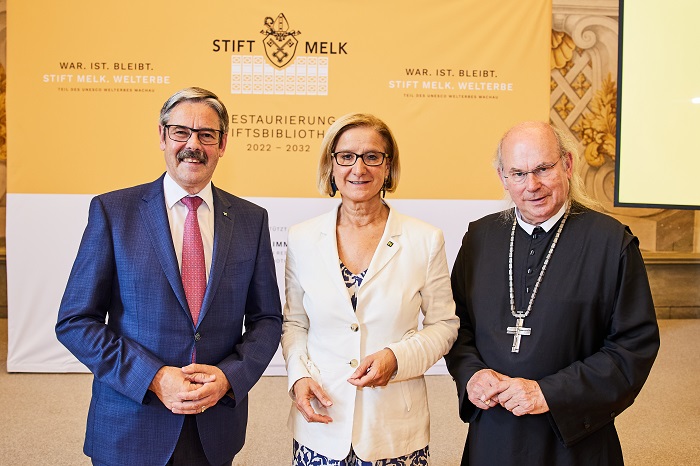 (v.l.n.r.) Erwin Hameseder, Präsident des Fördervereins, Landeshauptfrau Johanna Mikl-Leitner und Abt Goerg Wilfinger OSB informierten in einem Pressegespräch über die zweite Etappe der Bibliotheks-Restaurierung. (c) Stift Melk Franz Gleiß