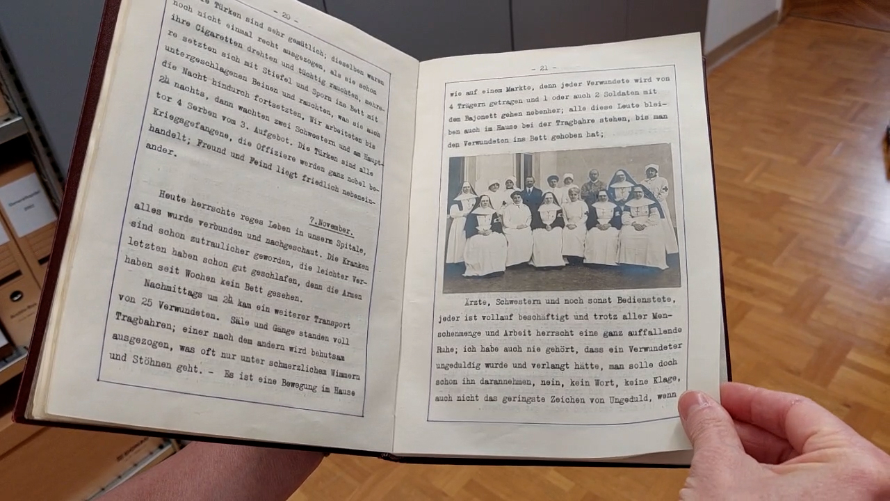 Nicole Jaufer, Archivarin der Kongregation, stellt im Video ihr Lieblingsstück des Archivs vor: Die Kriegschronik, die Aufzeichnungen der Ordensschwestern über ihre Kriegseinsätze von 1912 bis 1919 enthält. Die gelebte Nächstenliebe der Ordensfrauen sei darin gut zu sehen, was das Buch für Jaufer so besonders macht.