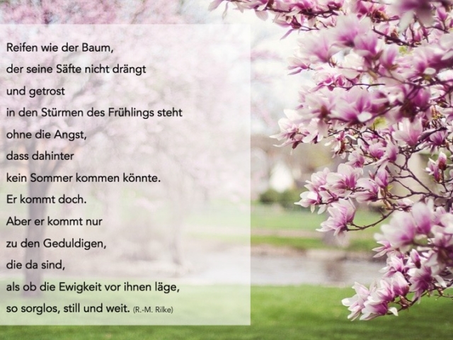 Es gibt einen Text von Rainer Maria Rilke, der mich schon lange beschäftigt. Die Auszüge aus einem Brief von Rainer Maria Rilke (www.rilke.de/briefe/230403.htm) begleiten mich auch durch diese Zeit. Jetzt erzählen sie von der Hoffnung auf den Sommer: