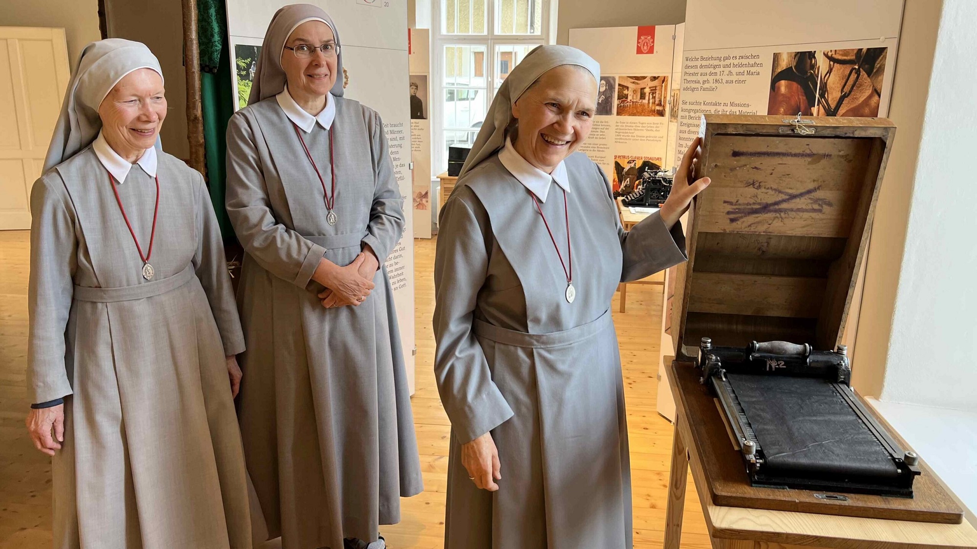 Die Missionsschwestern vom heiligen Petrus Claver mit einem historischen Kopiergerät für "Echo aus Afrika", das im Maria Theresia Ledóchowska-Museum in Maria Sorg in Salzburg ausgestellt ist. (c) mtl Download