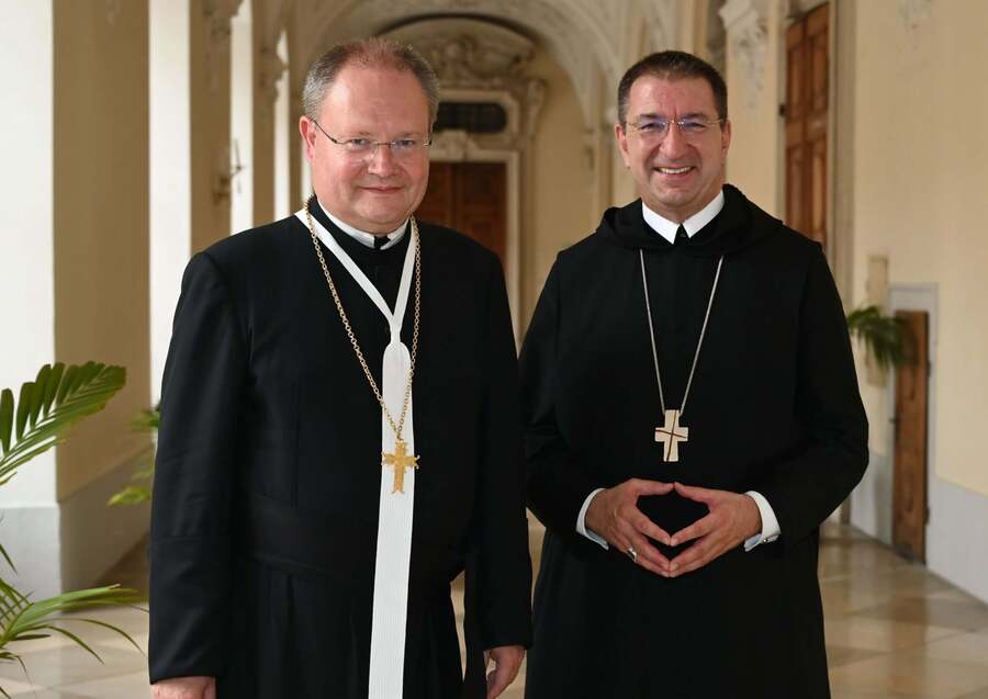 Propst Anton Höslinger (links) trug das Grußwort von Erzabt Korbinian Birnbacher (rechts) vor. (c) Stift Klosterneuburg/W. Hanzmann