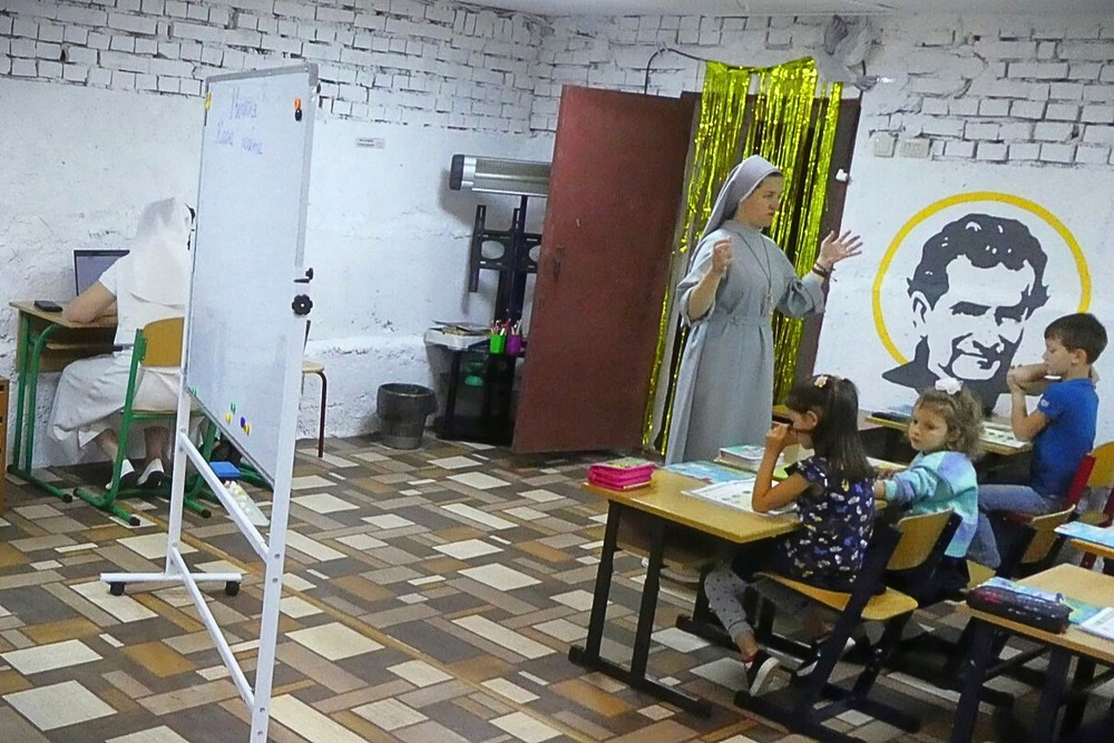 Erfolgt ein Raketenangriff während des Unterrichts, dann wechselt man sofort in den im Gebäude vorhandenen Luftschutzraum. Für Sr. Anna und die Schulkinder ist das inzwischen fast schon Routine: „Unsere Schülerinnen und Schüler sind das Prozedere mittlerweile gewohnt. Wir gehen hinunter, und dann läuft der Unterricht weiter.“ Da die Schule der Ordensfrauen nicht allzu groß ist, haben in ihrem Luftschutzraum auch alle Platz. Das sei ein großer Vorteil und ermögliche – im Gegensatz zu den großen staatlichen Schulen – einen durchgängigen Schulbetrieb von 9 bis 18 Uhr, berichtet die Don Bosco Schwester.
