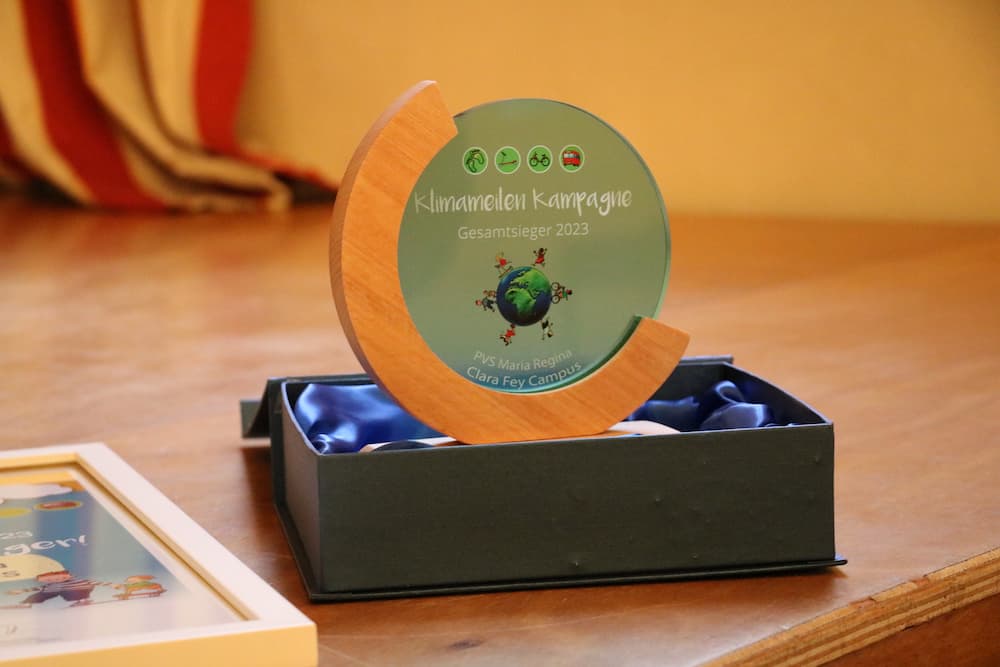 Geschafft: Unter 252 Kindergärten und Schulen aus ganz Österreich konnte sich der Maria Regina Clara Fey Campus durchsetzen und darf sich die Trophäe für den Gesamtsieg der Klimameilen-Kampagne 2023 ins Schulregal stellen. © Tristan Brucker/Klimabündnis Österreich