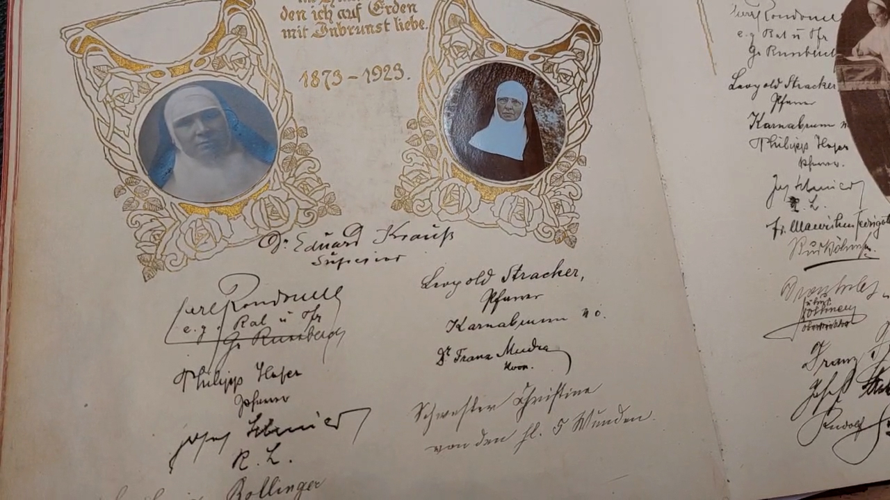 Sr. M. Antonella Watzak, die seit vielen Jahren das Archiv des Mutterhauses verwaltet und die Chronik weiterschreibt, präsentiert im Video einige Gästebücher. Im ältesten davon befindet sich die Unterschrift von Kaiserin Karolina Augusta (1792-1873), die das Kloster und die Schule in Wien stiftete. Auch Kaiserin Elisabeth verewigte sich in einem der Gästebücher. Außerdem im Video zu sehen: Ein Gästebuch, in dem viele Seiten jeweils dem Anlass entsprechend von Schwestern künstlerisch gestaltet wurden.