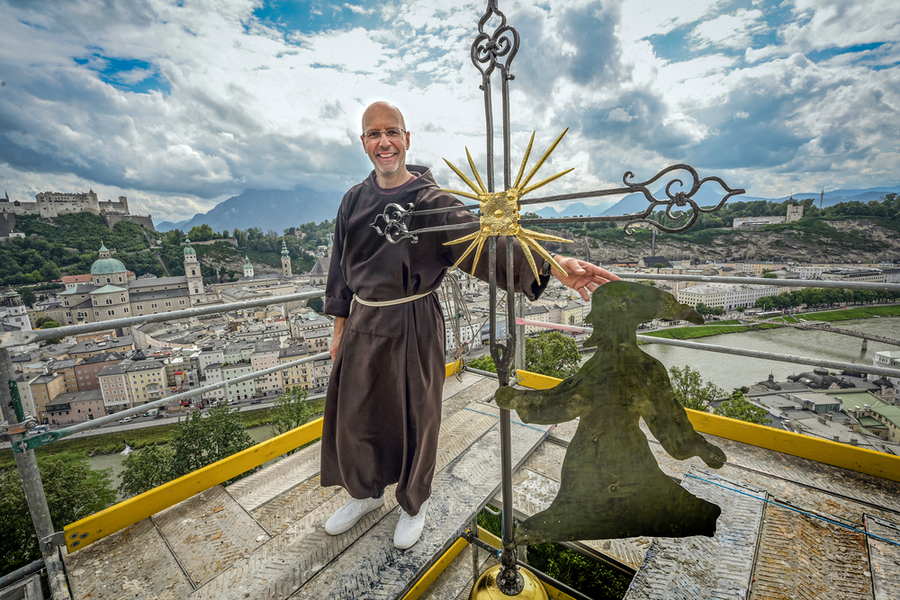 Schwindelerregende Höhen sind für Bruder Stephan kein Problem. Der Kapuziner ist ein geübter Kletterer und empfing hoch oben, 23 Meter über dem Klostergarten, das zuvor für die Renovierung abgenommene Kreuz des Klosters. Am Fuß des Kreuzes befindet sich eine goldene Kugel, die eine Zeitkapsel beinhaltet. Dort hinein haben die Kapuziner neben kleinen Opfergaben unter anderem auch ein Tagesevangelium und den Namen des amtierenden Papstes und Erzbischofs gelegt.