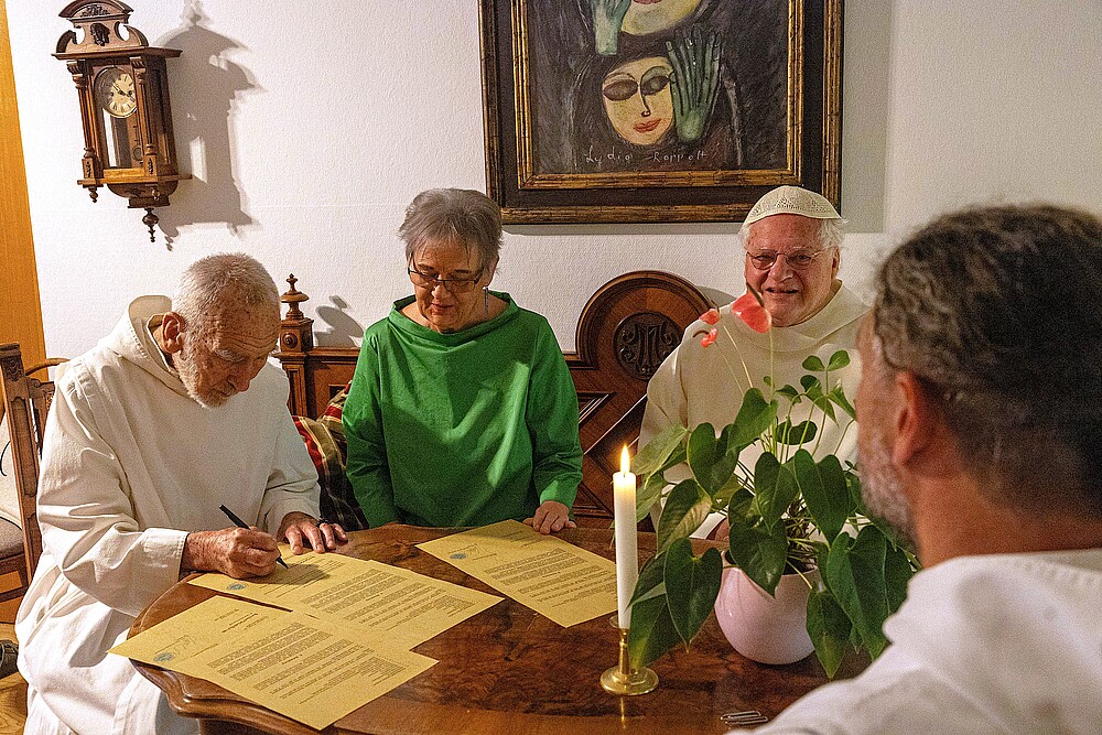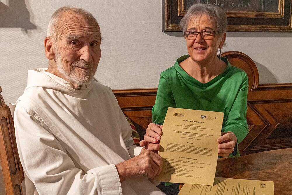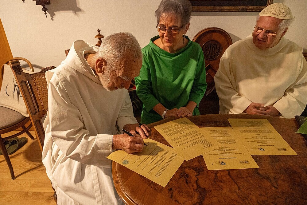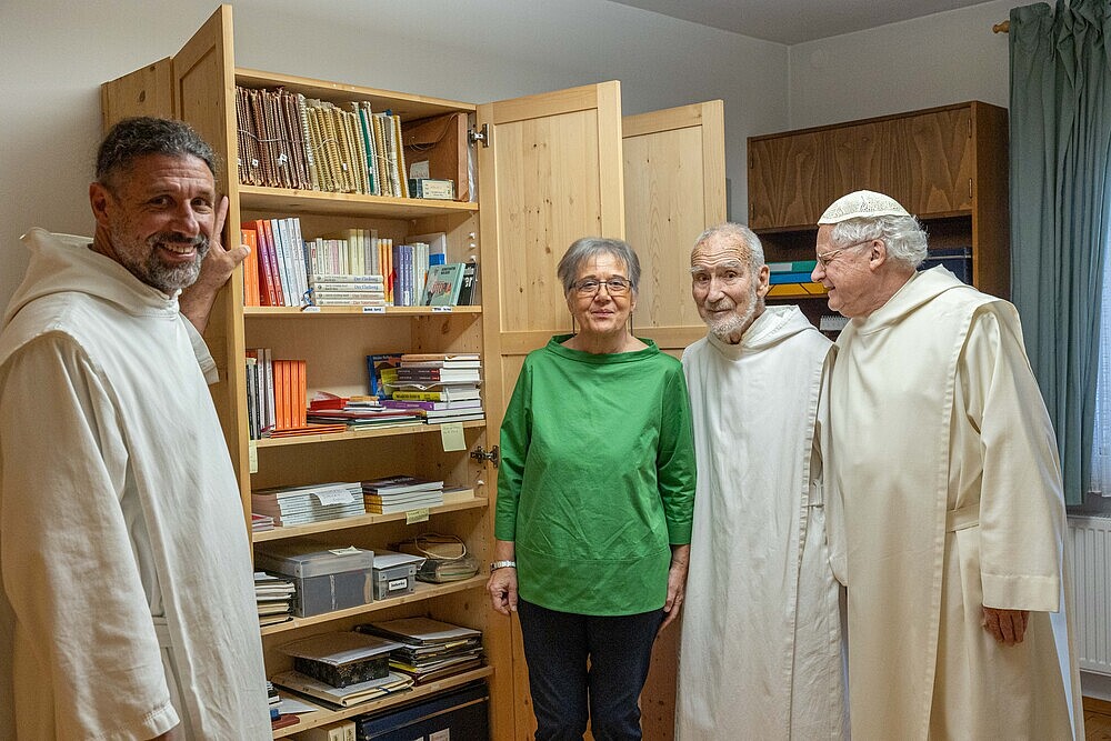 Der Vorlass von Steindl-Rast ist auch eine Herzensangelegenheit der Bibliotheksleiterin Ursula Schachl-Raber, die mit 31. Oktober 2024 in den Ruhestand tritt. Vor wenigen Tagen war sie ins Europakloster Gut Aich gekommen, wo im Beisein von Gründungsprior P. Johannes Pausch OSB und Prior Thomas Hessler OSB die schriftliche Übergabe erfolgte.