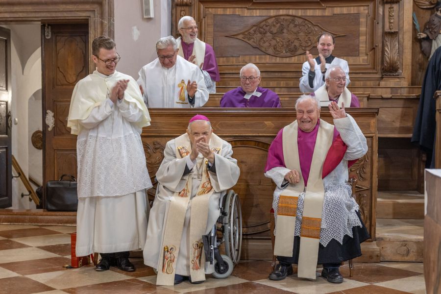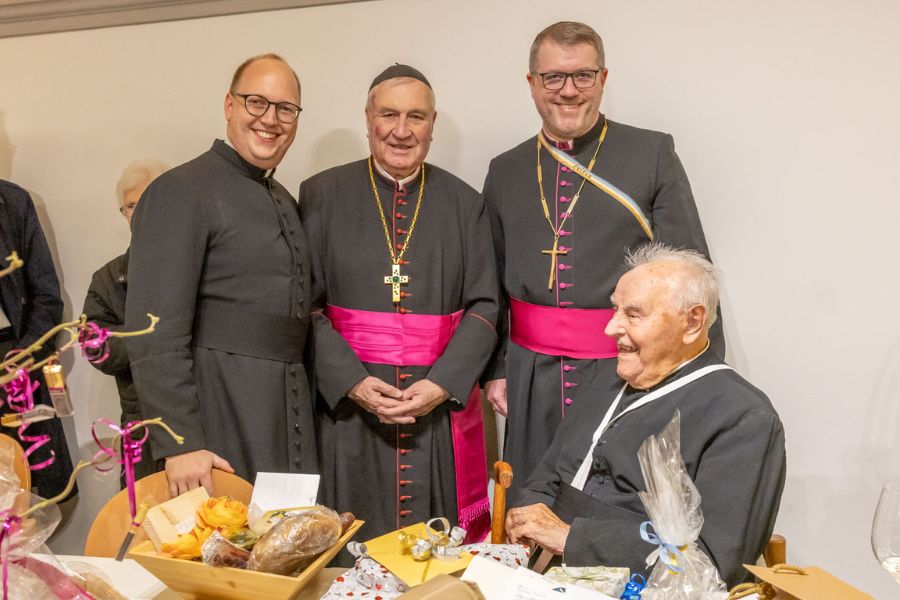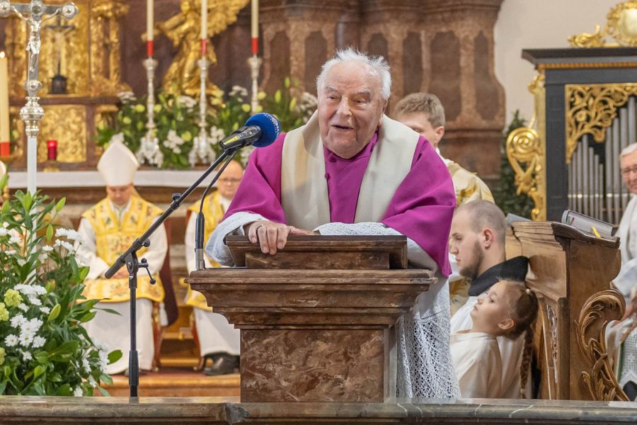 Besonders berührt haben die Worte des Jubilars am Ende des Festgottesdienstes: H. Roman erzählte mit noch kräftiger Stimme aus seiner bewegten Lebensgeschichte. 1924 in Hohenfurth (Vyssi Brod) geboren, trat er 1946 in das Stift Reichersberg ein und wurde 1951 in Linz zum Priester geweiht. Über 33 Jahre war er Rentmeister des Stiftes. Er gründete das Bildungszentrum im Stift Reichersberg und initiierte 1956 die Konzertreihe „Reichersberger Sommer“, die bis heute ein kultureller Anker der Region ist. Bis heute spielt er regelmäßig die Orgel. Für seine Verdienste wurde er sowohl von der Republik Österreich als auch vom Land Oberösterreich ausgezeichnet.