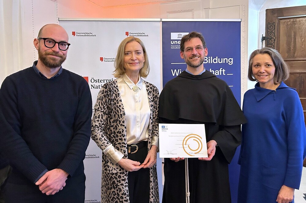Entgegengenommen haben die Urkunde für die Minoriten der Provinzkustos P. Bernhard Lang und der Bibliothekar der Zentralbibliothek, Pol B. Edinger. In einer kurzen Stellungnahme betonte P. Bernhard nicht nur den großen Reichtum an Kultur, Musik und Literatur, den die Minoriten in ihrer Wiener Zentralbibliothek und dem Archiv betreuen und sichern, sondern auch die Wichtigkeit, diese Bestände für die Wissenschaft und Gesellschaft zu öffnen. „Die Aufnahme ins österreichische Memory of the World Register der UNESCO betont diesen großen kulturellen Schatz der Minoriten, die seit 800 Jahren in Österreich präsent sind!“, freut sich Pol B. Edinger.