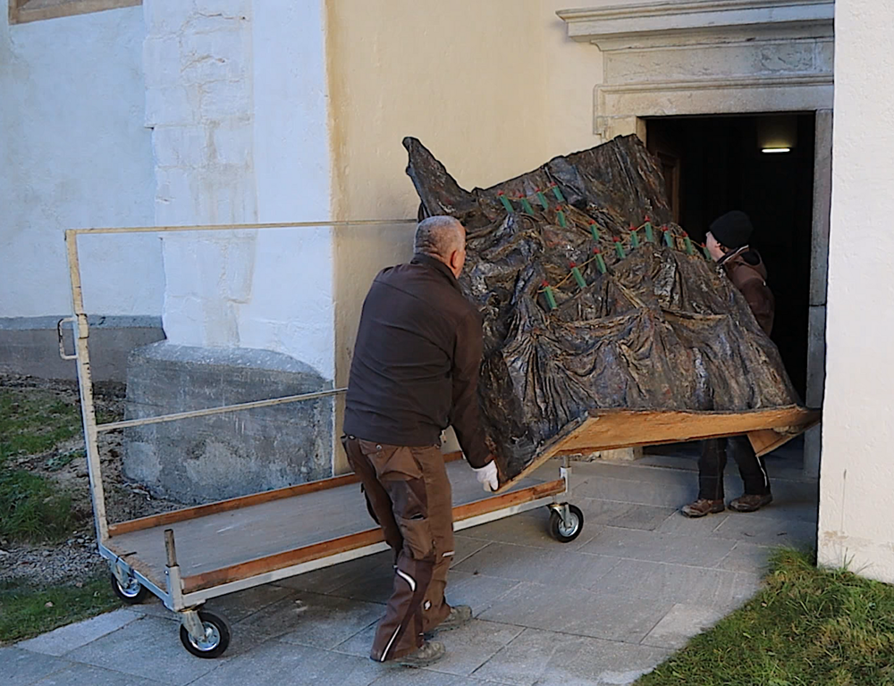 Restauratorin Erika Thümmel und ihr Team haben in der Werkstatt in Graz an der St. Lambrechter Krippe gearbeitet, mehrere Wochen hindurch haben sie – gemeinsam mit freiwilligen Helfern – in der Alten Werkstatt im Stift verbracht, um die Berge und die Malereien des Unterbaus fachkundig zu restaurieren. © Stift St. Lambrecht