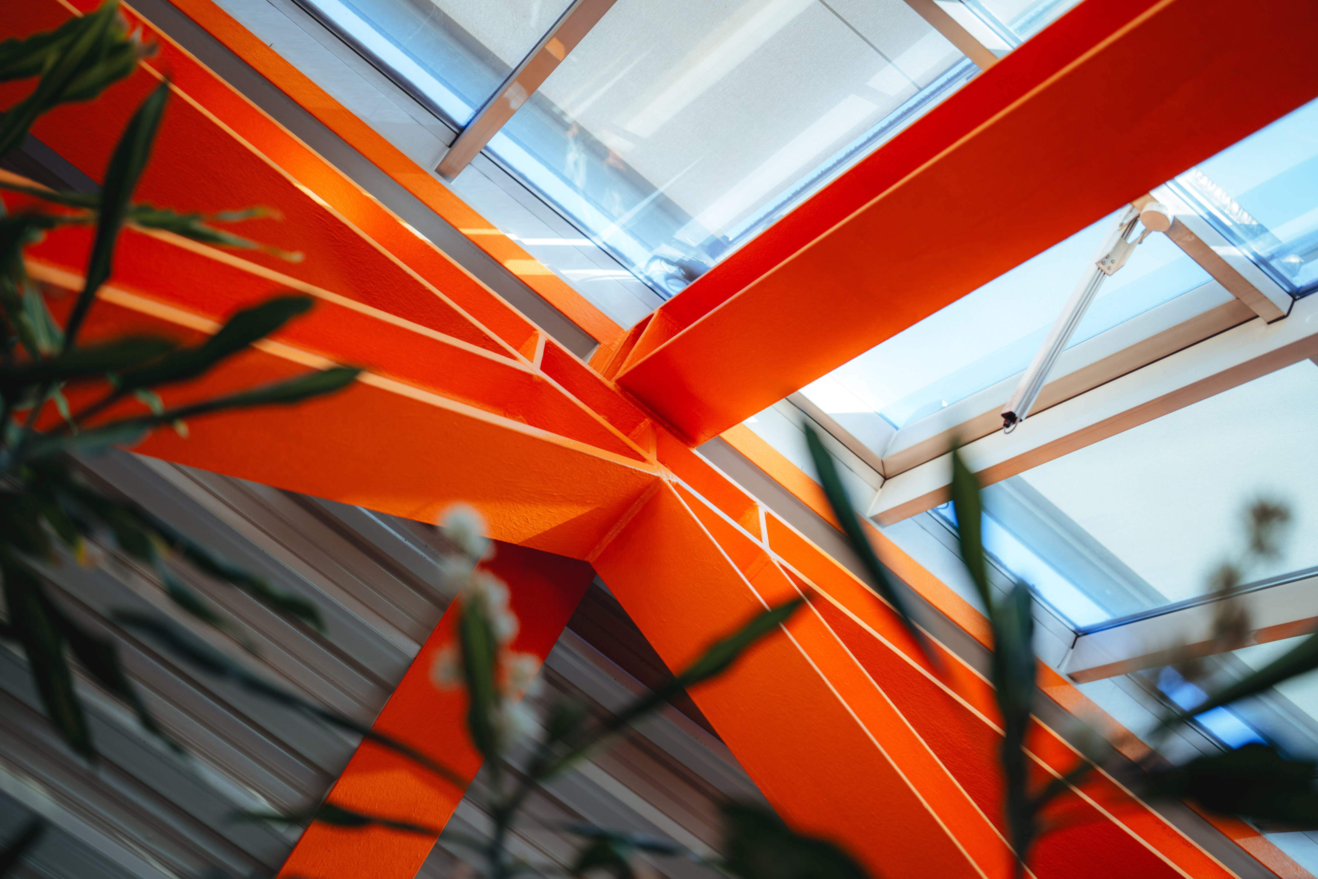 Das Schulgebäude der Ursulinen fällt besonders durch seine markanten, leuchtend orangefarbenen Stahlfachträger in Dreiecksform auf. (c) Fabian Weirather