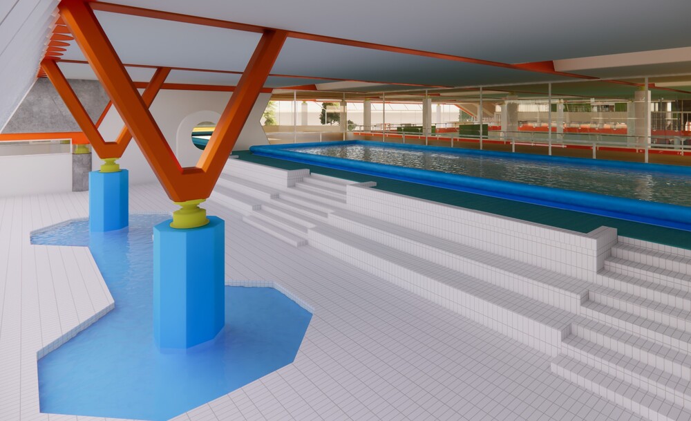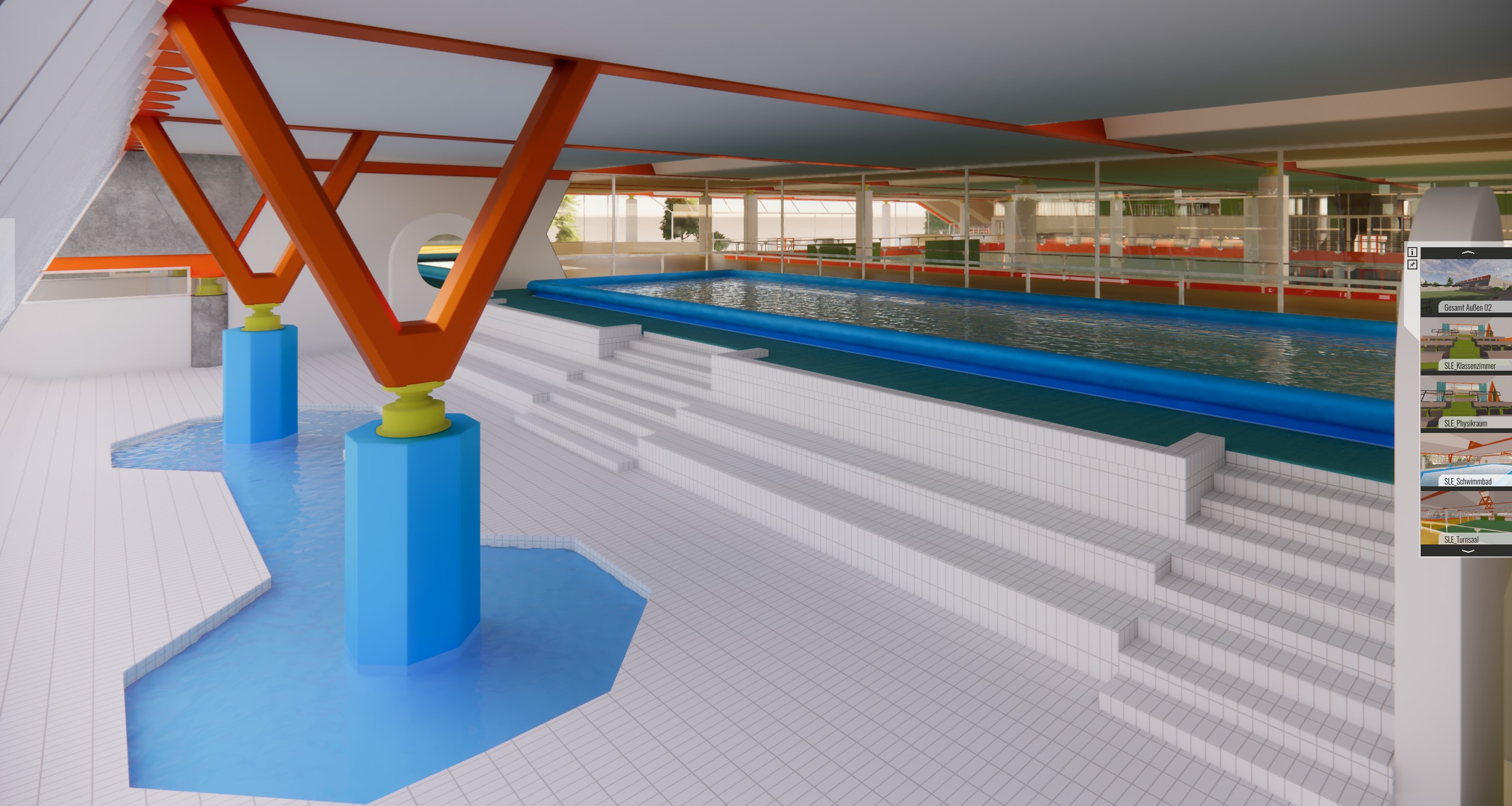 Das Schwimmbad in typischer Lackner-Architektur als Virtual Reality-Modell. (c) Arbeitsbereich Baumanagement, Baubetrieb und Tunnelbau (iBT) Foto-Download