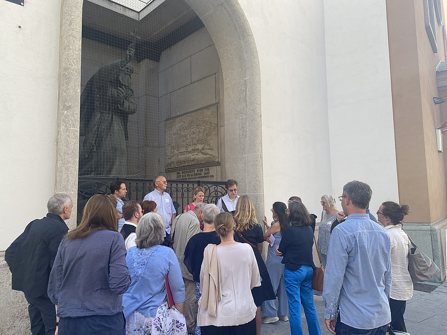 Die letzte Station der Kirchenerkundung war das Marco d’Aviano-Denkmal vor der Kirche. Die beiden Kulturvermittler:innen gaben dabei Informationen zur Biografie des 1699 in Wien verstorbenen und 2003 seliggesprochenen Kapuziners. Außerdem wurde ein Briefwechsel zwischen Marco d’Aviano und Kaiser Leopold I. verlesen, wobei einige Passagen den Originaltexten entnommen waren.