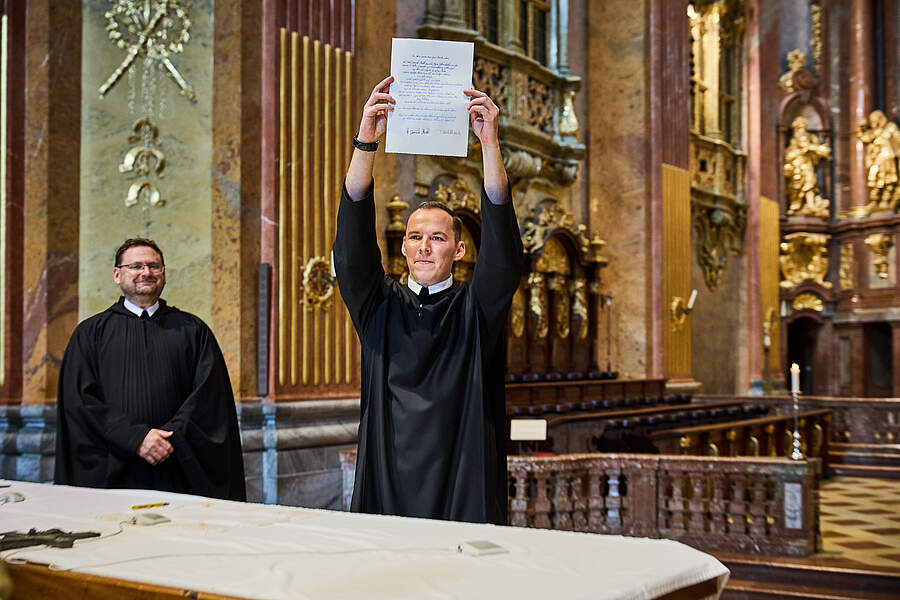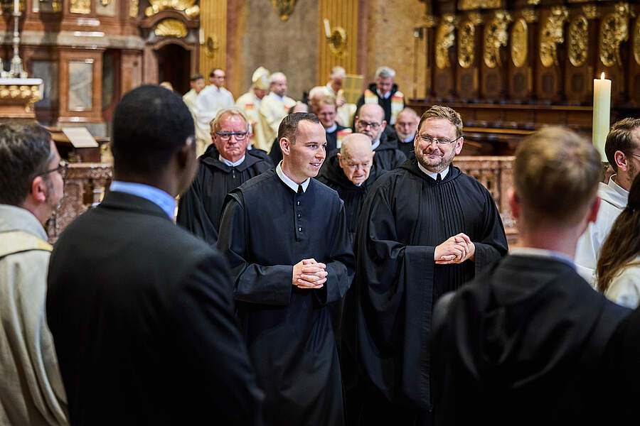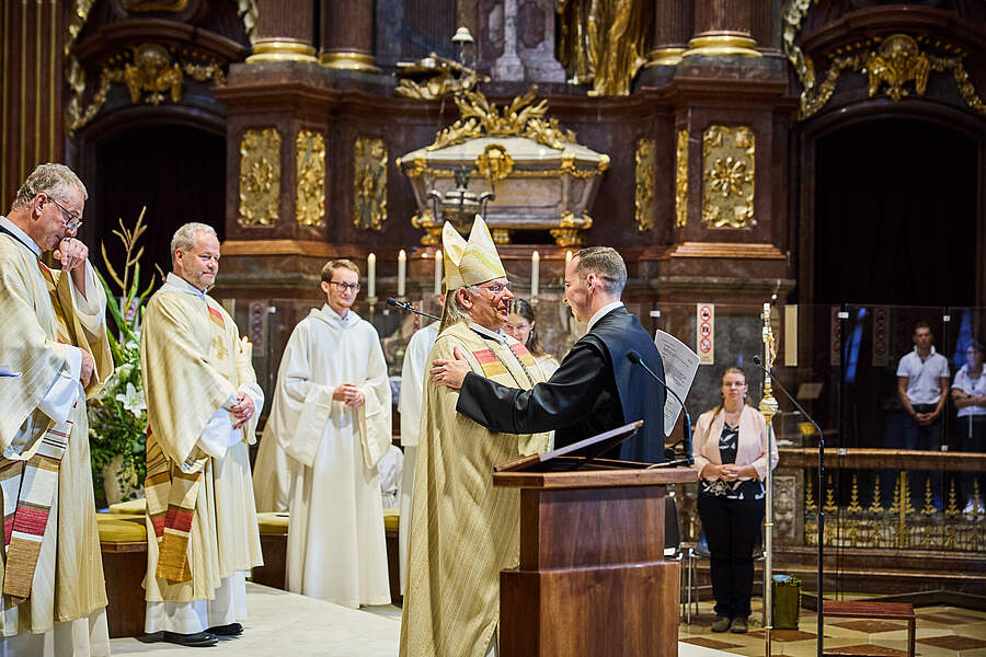 Nicht nur der Konvent des Benediktinerstiftes, sondern auch Familie, Freunde und Wegbegleiter:innen von Fr. Dominik Marold, Mitarbeitende und Freunde des Hauses feierten den festlichen Gottesdienst in der Stiftskirche mit. Im vergangenen Jahr, in dem er sein Noviziat absolvierte, stand das gegenseitige Kennenlernen im Mittelpunkt.