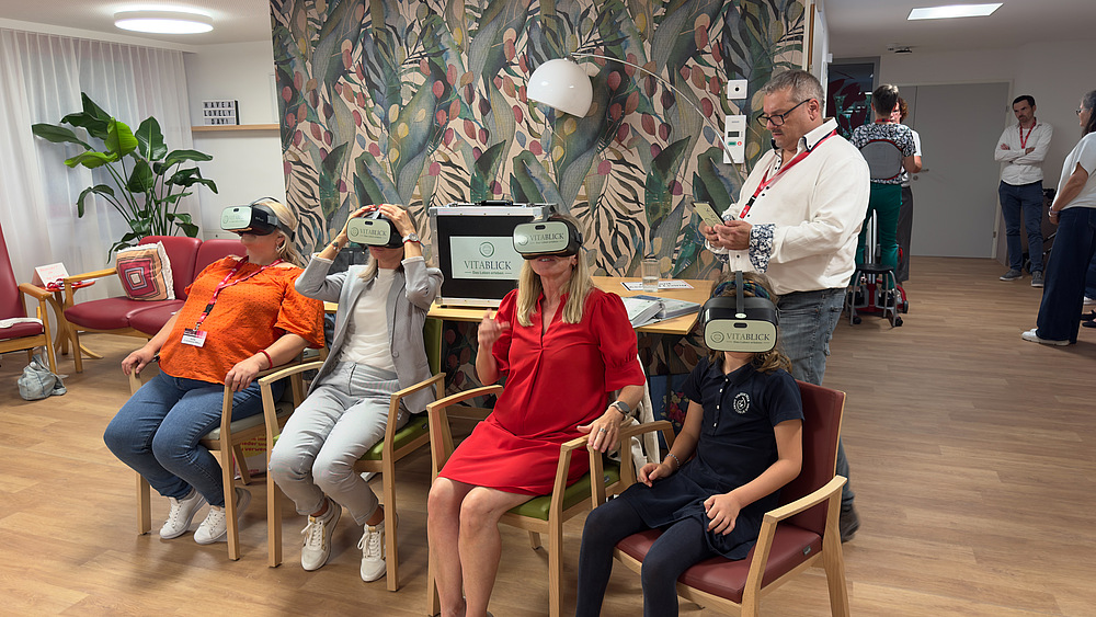 Die Vergangenheit im Blick: Im Rahmen des Palliativ-Fachtags konnten die Besucher:innen ein Virtual-Reality-System testen, das es Menschen mit eingeschränkter Mobilität ermöglicht, mit einer Spezialbrille besondere Orte aus ihrer Vergangenheit zu bereisen und neu zu entdecken. © Caritas Socialis