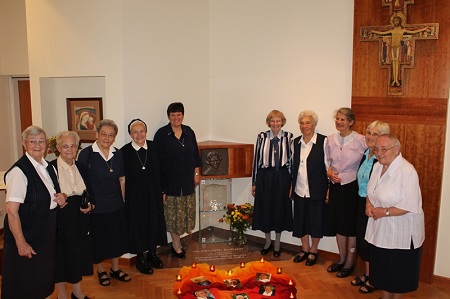 Die neun Jubilarinnen mit Generalleiterin Sr. Susanne Krendelsberger am Grab Hildegard Burjans in der Pramergasse