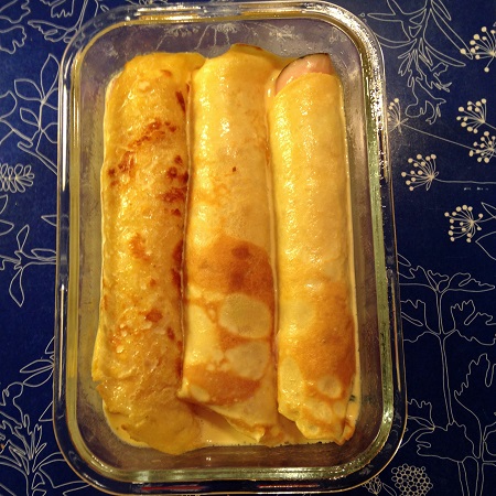 Alle Zutaten zu einem glatten Teig verrühren, herausbacken, mit Schinkenscheiben und Käse belegen, einrollen und in befettete Auflaufform legen. Alle Zutaten für den Guss mixen, übergießen. Ca 25 Minuten bei 160 Grad im Rohr überbacken.