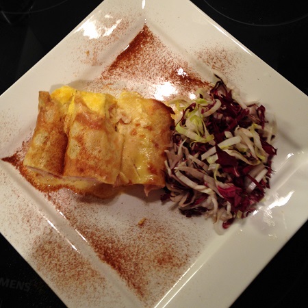 Palatschinken gehören zur österreichischen Küche. Sie sind mit wenig Aufwand herzustellen und können vielfältig verwendet werden. Das macht sie so beliebt. Sie eigenen sich auch zum Tiefkühlen – ganz oder geschnitten zu Frittaten. Wer Kalorien bzw. Fett sparen möchte, nimmt für den Guss statt Obers Kaffeeobers.