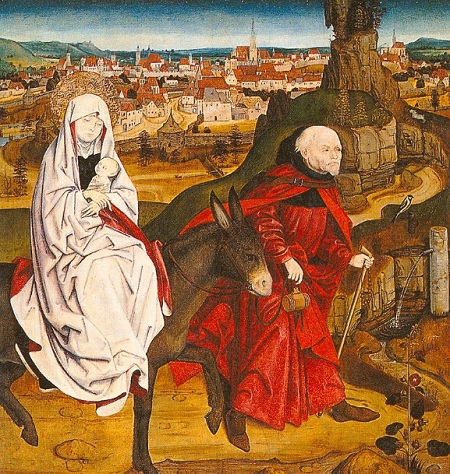 Flüchtlingsfamilie vor 2000 Jahren: Maria und Josef mit ihrem Kind auf der Flucht nach Ägypten. Die mittelalterliche Stadt Wien dient dabei als Hintergrund. (c) Schottenstift