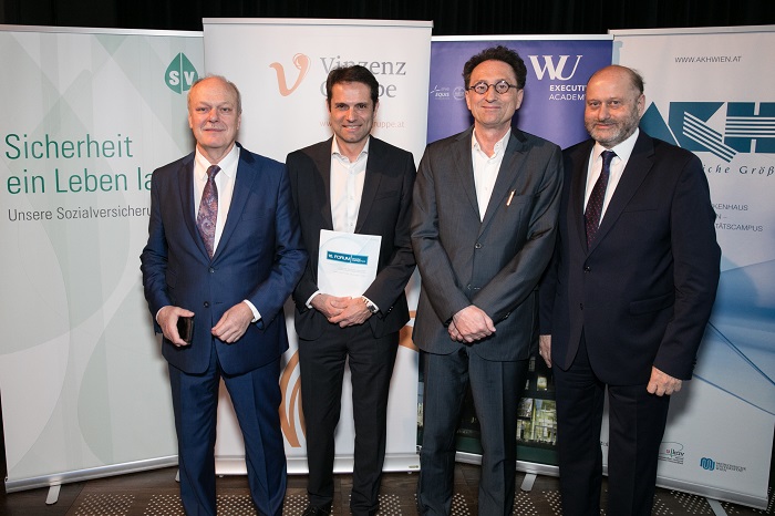 Die Veranstalter des 16. Forums Hospitalmanagement: von links: Dr. Josef Probst, Generaldirektor im Hauptverband der österreichischen Sozialversicherungsträger; Dr. Michael Heinisch, Geschäftsführer der Vinzenz Gruppe und Leiter der ARGE Ordensspitäler; a.o. Univ. Prof. Dr. Johannes Steyrer, Leiter des MBA Health Care Management an der WU-Wien; DI Herwig Wetzlinger, Direktor der Teilunternehmung AKH Wien. Foto: © Vinzenz Gruppe / Martin Nußbaum