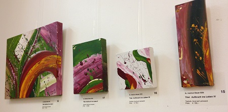 „Treten sie ein in den Dialog mit meinen Bildern“, lädt die Künstlerin Heidrun Bauer die BesucherInnen der Ausstellung ein und lässt alle wissen: „Malen ist mir schon in die Wiege gelegt worden. Durch eine schwere Krankheit bin ich wieder auf meine ursprünliche Begabung zurückgeworfen worden. Das Spiel mit den Farben lässt mich seitdem nicht mehr los.“ Pater Albert Gabriel, Rektor der Donau City Kirche und auch Salvatorianer, ist erfreut, „dass heute Kunst und Kirche wieder mehr zusammenkommen“. Durch die Entfernung in den letzten Jahrzehnten ist die „Kunst vielleicht inhaltsloser und die Kirche kühler geworden“. Dabei ist P. Albert angesichts der gezeigten Bilder überzeugt, „dass Kunst der Kirche hilft, Gott zu erspüren, zu begreifen, zu sehen und zu hören. Gerade künstlerisch begnadete Menschen vertiefen und erweitern unsere Sichtweisen.“ P. Albert charakterisiert die Künstlerin Heidrun Bauer auch als Ordensfrau: „Sie ist eine typisch moderne Ordensfrau, selbstbewusst und emanzipiert, hoch gebildet und ausdrucksstark.“