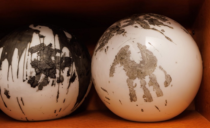 Sr. Ruth Lackner: Wenn etwas momentan passiert, mit dem ich sonst nicht zurechtkomme. Etwa als im Kosovo-Krieg in Belgrad das Licht ausgegangen ist, weil die Nato Graphitbomben auf die Stadt geschmissen hatte. Diesen Schock – das Licht ist weg! – habe ich bearbeiten wollen. Als ich im Keller Glaskugeln von unseren alten Gangbeleuchtungen fand, trug ich darauf mit meinen – in heißes Wachs getauchten – Händen Graphitstaub auf. Sozusagen als der letzte Griff nach dem Licht.