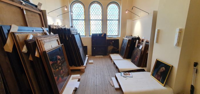 Zunächst standen die Studierenden vor der Herausforderung, sich einen Überblick über die im Depotraum, der Sakristei und in diversen Gängen und Räumen untergebrachten Kunstgegenstände zu verschaffen. Es wurden Arbeitsplätze mit Tischen und Materialien vorbereitet, dann konnten die Kulturgüter von den angehenden Kunstexpert:innen nach Fachbereichen geordnet und entstaubt werden.