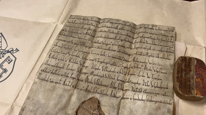 P. Ludwig Wenzl, der Leiter des Archivs, präsentiert ein zwar unscheinbares, aber zugleich fundamentales Dokument: Die Urkunde der ersten Schenkung an das Stift Melk, die sich auf die Jahre vor 1075, vor der Gründung des Hauses, beläuft. Das Spannende daran sei, dass das Wesentliche oft in unscheinbaren Dingen liege.