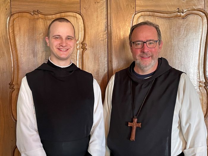 Abt Vinzenz zu seinem jungen Mitbruder: „Du bereicherst unsere Gemeinschaft und all jene Bereiche, in denen du tätig bist. Gott segne dich.“ (c) Kloster Mehrerau