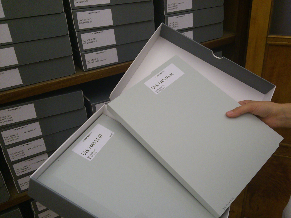 Abb. 2: Die mittelalterlichen Urkunden wurden in säurefreie Mappen umgelegt. So können sie weiterhin in den historischen Möbeln gelagert werden. (Foto: Schottenstift Wien)